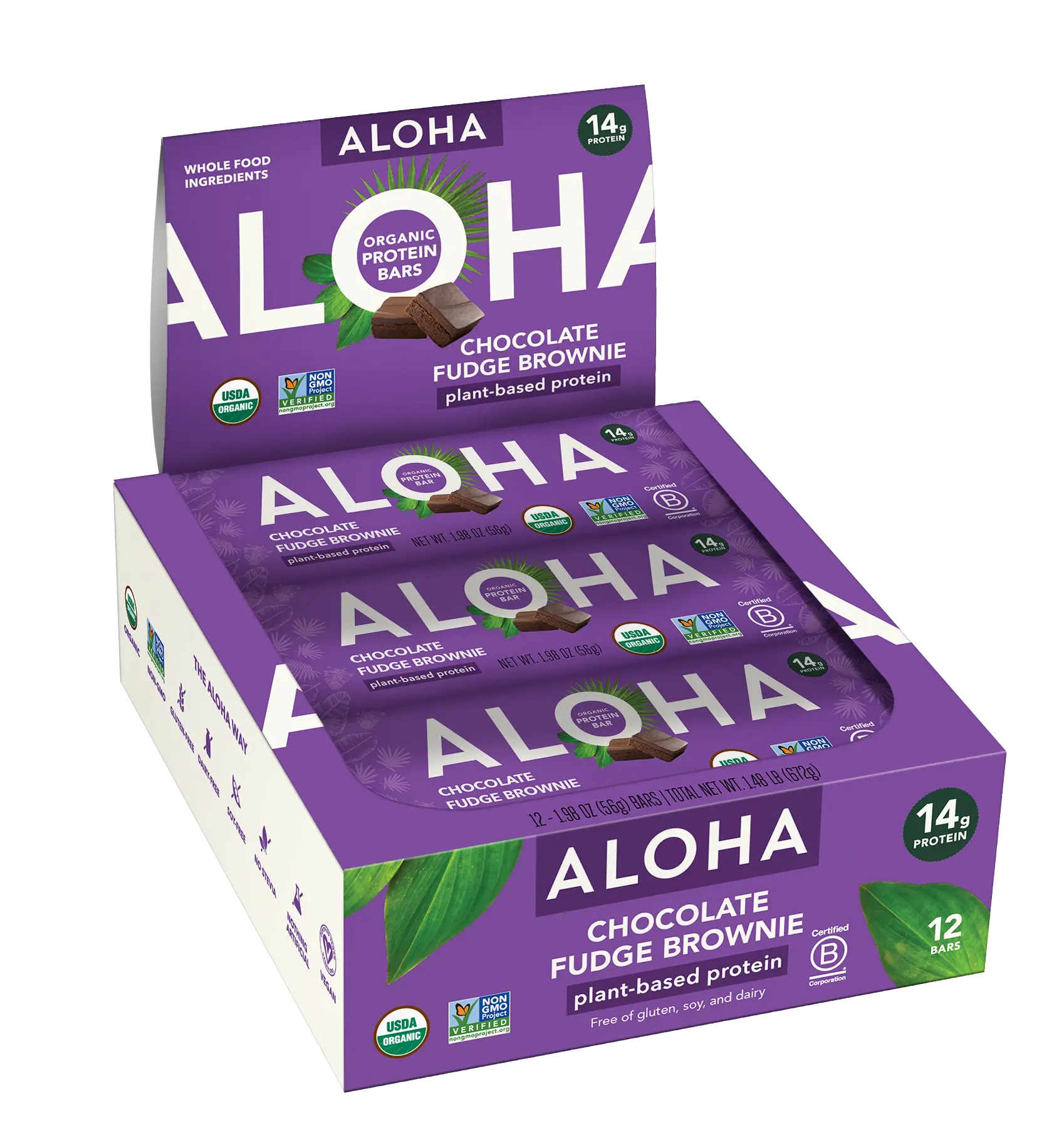 Box of Aloha peanut butter chocolate chip protein bars with organic labeling.